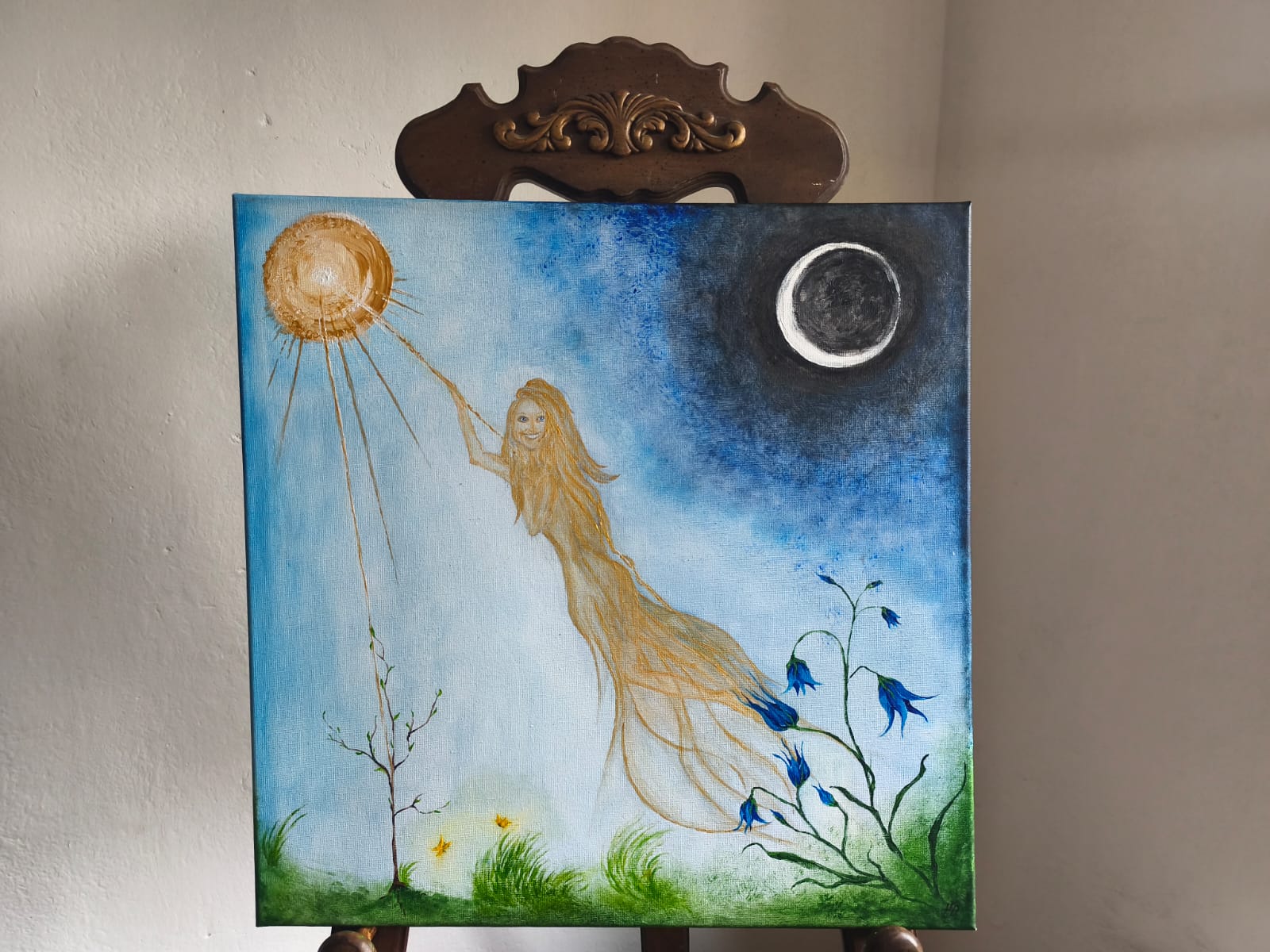 Zavřu oči, pomyslím na tebe, a něco se mi zjeví před očima. Ten výjev i náladu vložím co nejvěrněji  na plátno a doplním jej podrobným popisem. Zpravidla názorně odhaluje stav a procesy v nitru člověka. Obrazy mohou mít působnost k uzdravování duše. Postup je takový, že když jsem požádána o vhled, zajistím si klid a pokusím se o propojení. Někdy se stává, že cítím během běžných činností, že vhled přichází. Tu chvíli je dobré podchytit a zastavit se. Výjev pak zavolám člověku, kterému je určen a barvitě jej popíšu ústně i na papír. Vhledy jsem dostala darem, tak je také darem dávám. Pokud si budete přát ukotvit poselství obrazem, můžete si sami určit cenový rozsah, do kterého se mám  vejít. Od věcného náčrtu po velký obraz akrylovými barvami. Cena se odvíjí od počtu strávených hodin. Kdyby mi vhled nepřišel, což se doposud nestalo, ale je třeba nemít na něj očekávání, vhledový motiv  mohu vyměnit za obraz jiný podle domluvy.